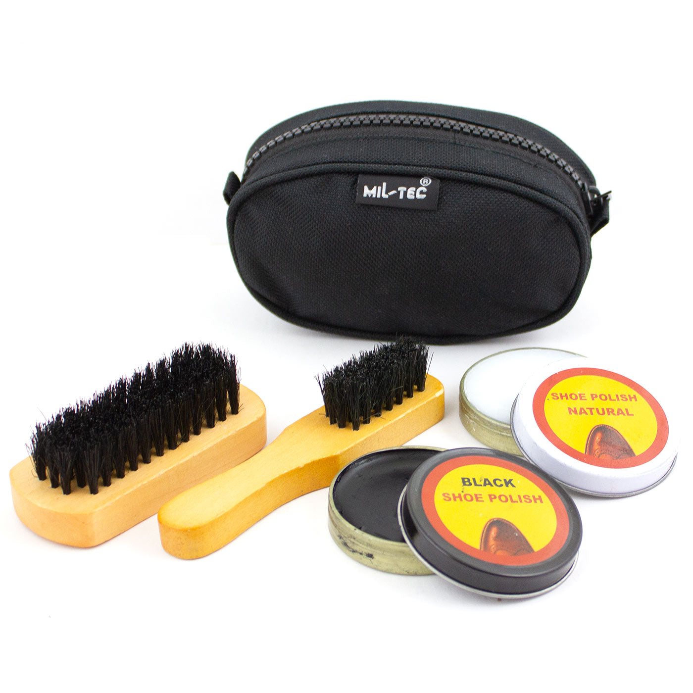• Two brushes, black polish, neutral shiner, cloth, and polyester zippered pouch included
