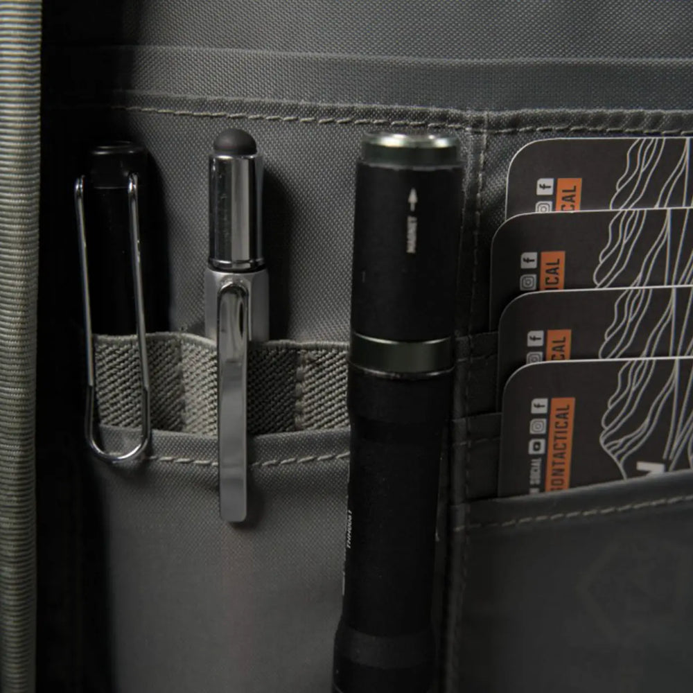 - Admin Compartment: Designed for optimal organization, this section features multiple pockets and pouches to securely store your gear. From business cards and pens to flashlights and tools, everything has its place. Two additional zipper pockets provide extra security for sensitive documents and equipment, while the integrated MOD Key Tether system keeps your keys or small tools within easy reach.